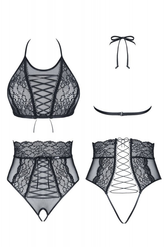 Трусики с завышенной талией и роскошным кружевным пояском подчеркивают линию талии и бедер. Спереди имитация шнуровки, сзади шнуровка из лент! Трусики с открытой промежностью, что позволяет заниматься любовью абсолютно беспрепятственно!