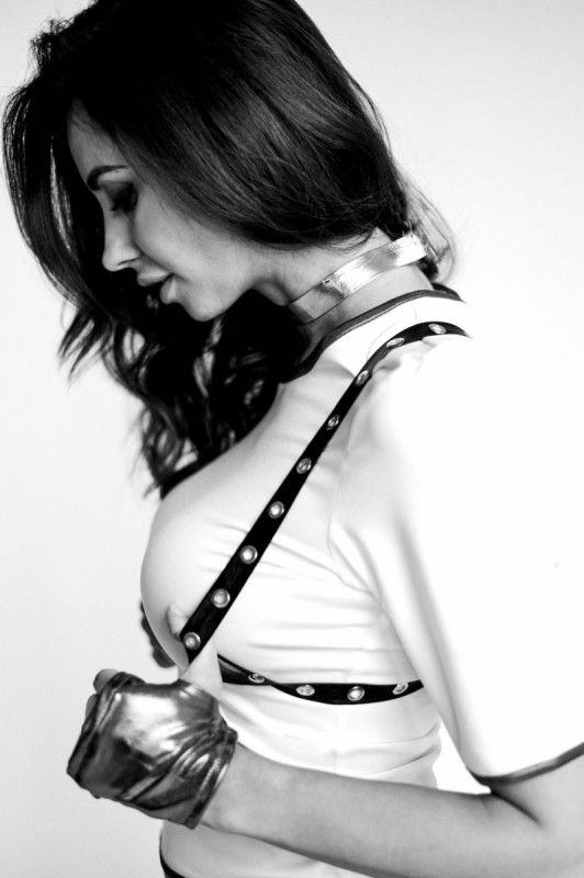 - Тонкий ремень и портупея из экокожи с декором из металлических клепок эффектно подчеркивают талию и грудь и создают изюминку в образе. Застегиваются на бельевой крючек